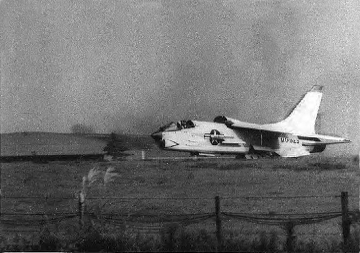 This is the first picture in an ejection series. To continue with the series you can click on the "NEXT" at the bottom of this page's text. As best recalled, Captain Michael Hanley was taking one of the VMF(AW)-235 birds on a test hop at NAS Atsugi in 1963. Shortly after takeoff roll he reported fumes or bad odor in the oxygen. He then told the tower that he was aborting T/O and proceeded to drop his hook for the mid-field gear. The tower reported a "hook skip" and Mike shut down the engine but continued towards the end of the duty runway and the fence at the bottom of the picture. NEXT picture in sequence. |
