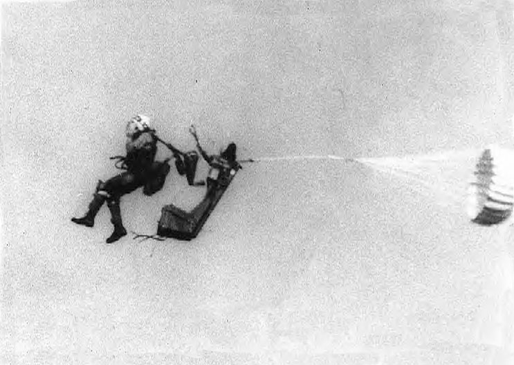 Here, Mike has managed to put his hands up to protect his face as the seat begins to separate. The Time Release Mechanism (TRM) has released the drogue shackle and it has begun to pull the main chute out of the pack. The TRM has also released the leg restraint lines and the survival kit latches. This has allowed Mike to start forward away from the seat. Between Mike and the seat his parachute pack has been freed from the seat (also by the TRM). The survival kit box can be seen attached to Mike's lower back area. For more information on the functions of the Martin-Baker Mk. F-5 ejection seat click here. NEXT picture in sequence. |